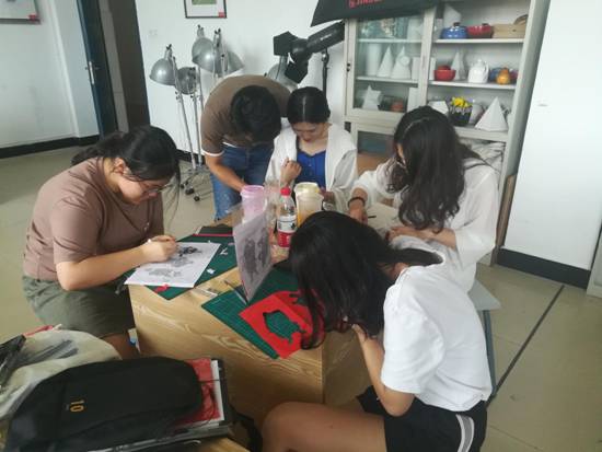 “平面雕刻创意大赛”项目小组在王明芝老师的指导下,在实训三406实训室进行紧张的赛前训练。