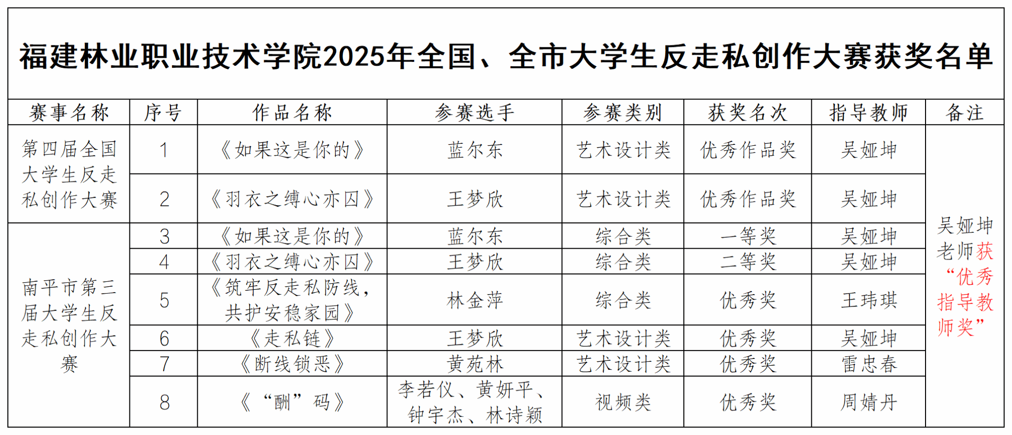 朱国雄对我院活动筹备及反走私普法教育工作成效给予高度赞赏,福建林业职业技术学院在南平高校中发挥了反走私宣传的示范引领作用,在校园内形成了浓厚的反走私氛围,希望接下来能持续深化合作,以赛育人、以创普法,共同推进反走私综合治理工作。