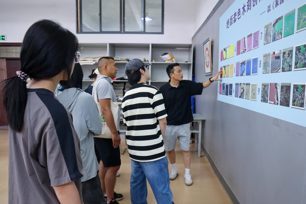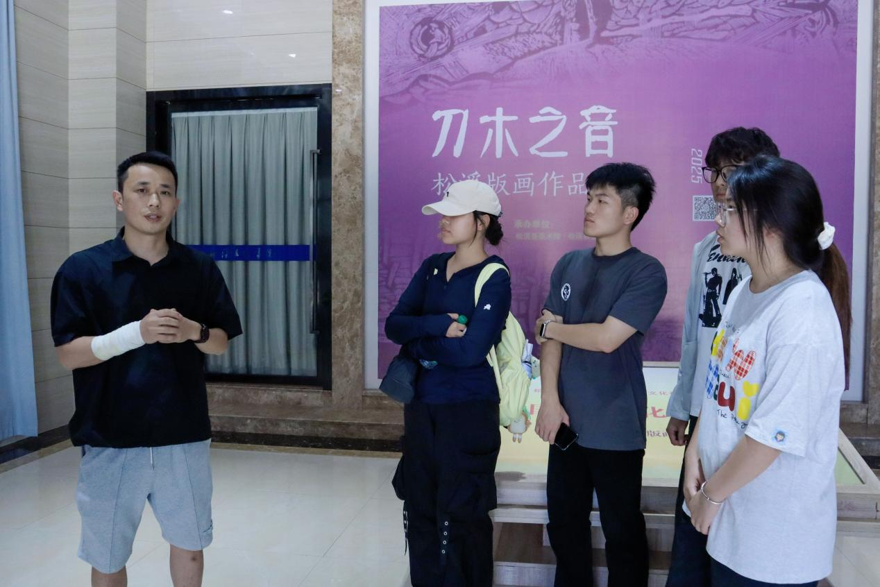 当日中午,志愿服务队抵达松溪县文化广场,跟随松溪县美术馆池达有老师,观赏了“刀木之音”松溪版画作品展。池老师以专业视角梳理松溪版画的发展脉络,通过对画展典型作品的分析,向大家深入剖析了这一省级非遗项目在现代宣传时面临的各种现实挑战。叶章球副书记以及廖士喜老师与队员们就宣传痛点这一方面进行分析、献策,为松溪文创传媒发展提供专业性的建议。在观展过程中,志愿服务队结合专业优势,对其文创设计方案开展构思工作。