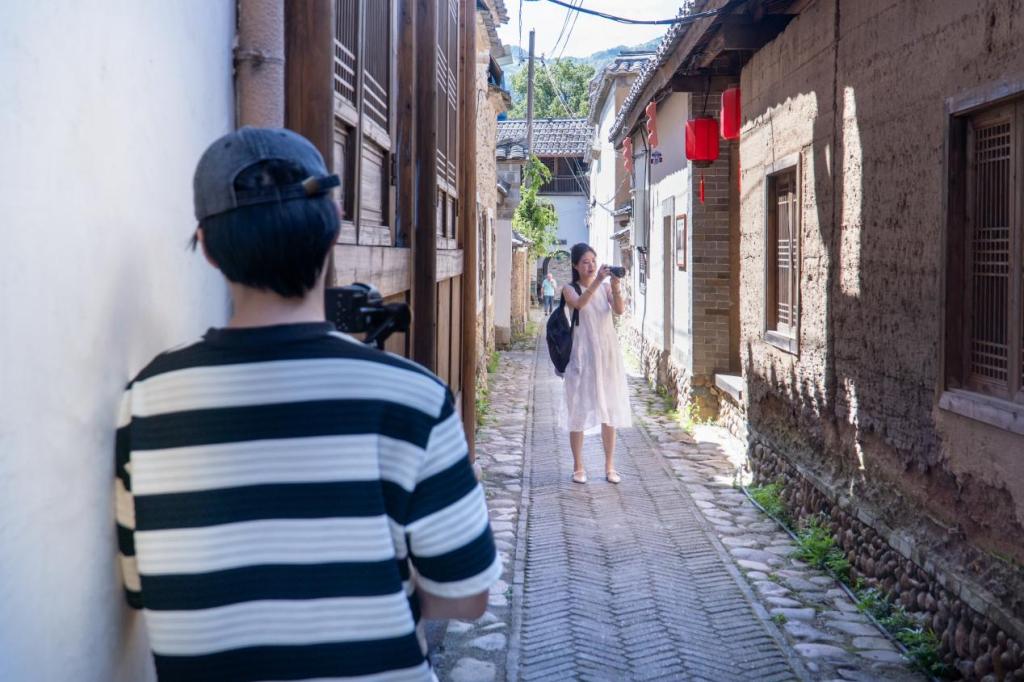7月4日,志愿服务队抵达寿山乡白玉村,走访当地村内风貌、遗存古建筑及稻田公社特色产业,并运用专业设备对其进行拍摄取景。作为省级乡村振兴试点村,白玉村在生态保护、文化传承以及乡村旅游融合发展方面成效显著,但仍存在宣传渠道受限等发展痛点。廖士喜老师就宣传痛点与当地乡镇宣传部负责人进行交流。他表示,系部团队将通过宣传片的制作助力屏南乡村文旅产业的宣传发展,同时希望持续深化校地合作模式,与优质乡村建立共建机制,发挥系部学生的专业优势,以传媒赋能乡村振兴,开展文创设计、文化挖掘等传媒志愿实践活动,推动产学研深度融合。