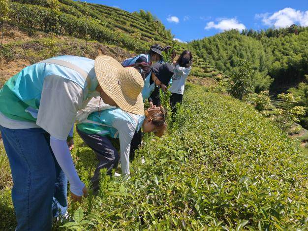 品质玉山,茶兴百业。实践队走进玉山镇岭口村,先后考察当地制茶企业以及翠冠梨种植基地。在凌云生态茶厂负责人带领下,队员们徒步高山生态茶园,得知玉山特殊自然条件造就高山生态茶卓越品质,茶山养护需格外注重生态环保。队员们亲自拔除茶树间杂草并弄碎掩埋,化作有机肥料,体验养护环节。随后,观摩体验制茶车间萎凋、凉青、做青、杀青等传统制茶工序;在霁语茶业手工茶审评室,感受手工茶与机器制茶在香味、口感等方面的不同特点。