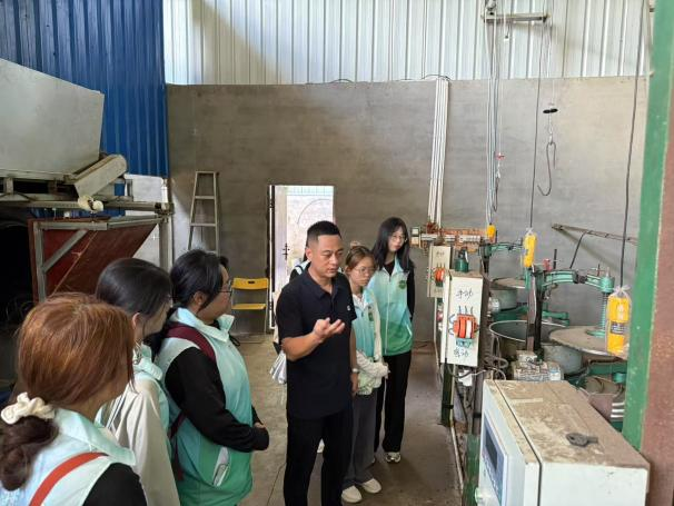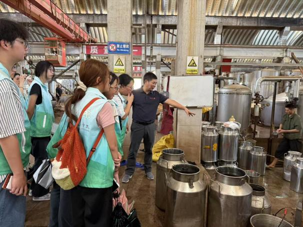 随后在双龙戏珠酒业副总经理吴小如的带领下,实践队深入桐源生产基地酿酒车间,现场观摩酱酒发酵、酿造全流程,沉浸式理解 “12987 坤沙工艺”—从端午制曲到九次蒸煮的匠心细节。