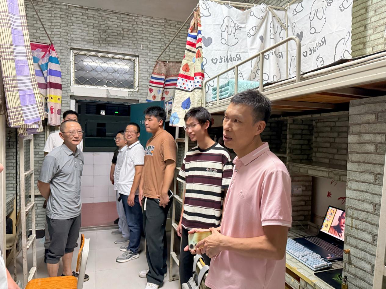 在走访过程中,詹其仙一行走进宿舍仔细查看新生的住宿环境,从床铺设施、水电供应到卫生状况,逐一细致询问,确保同学们的生活需求得到保障。