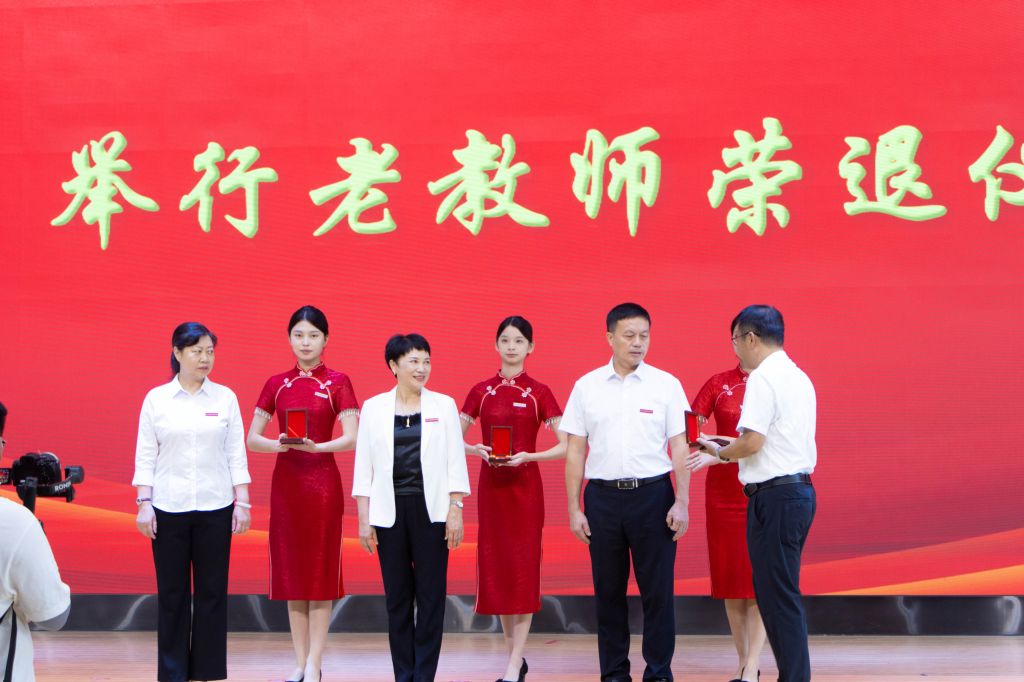 党委书记陈建辉为退休教师颁发荣退纪念章