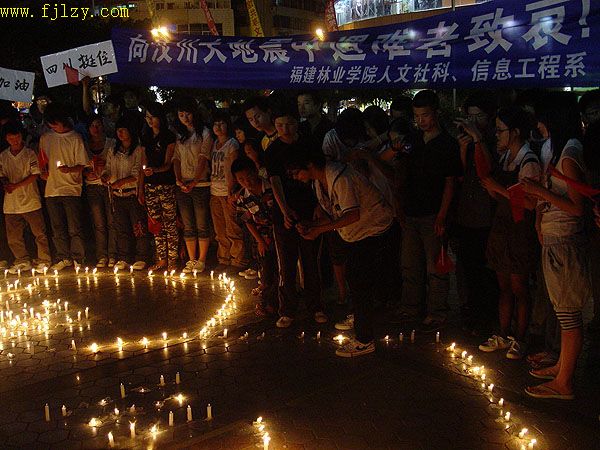 本网讯 5月20日晚,人文社科系(信息工程系)的100名学生在邹小燕老师的带领下,到南平文化广场举行为灾区祈福活动。同学们用蜡烛摆出两个心图案,两个心中间则摆出了汶川与南平的字样。活动开始中时,大家一起演唱了庄严的国歌和歌曲《让世界充满爱》。歌曲过后全场默哀三分钟。举行了以《孩子,抓紧妈妈的手》为主题的诗歌朗诵,并高喊“汶川挺住,中国加油”的口号,活动最后在闽江放流了载着蜡烛的纸船。