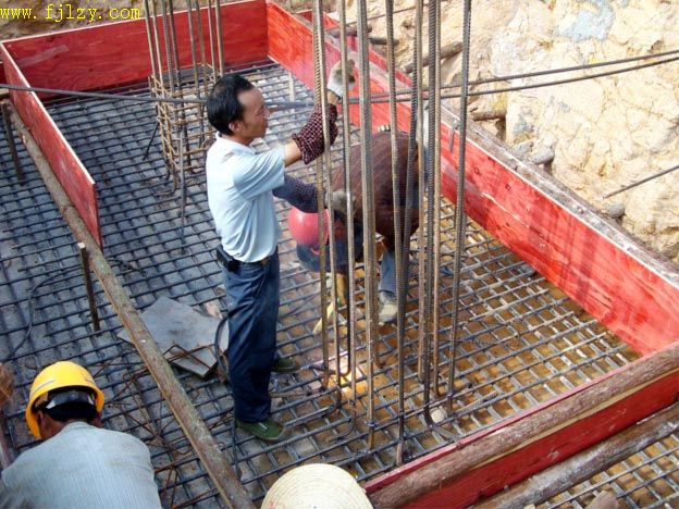 工人正在安装学生公寓2号楼承台、基础梁模板