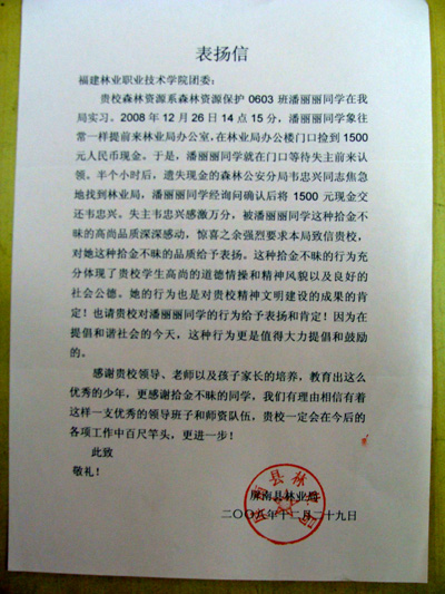 贵校森林资源系森林资源保护0603班潘丽丽同学在我局实习。2008年12月26日14点15分,潘丽丽同学象往常一样提前来林业局办公室,在林业局办公楼门口捡到1500元人民币现金。于是,潘丽丽同学就在门口等待失主前来认领。半个小时后,遗失现金的森林公安分局韦忠兴同志焦急地找到林业局,潘丽丽同学经询问确认后将1500元现金交还韦忠兴。失主韦忠兴感激万分,被潘丽丽同学这种拾金不昧的高尚品质深深感动,惊喜之余强烈要求本局致信贵校,对她这种拾金不昧的品质给予表扬。这种拾金不昧的行为充分体现了贵校学生高尚的道德情操和精神风貌以及良好的社会公德。她的行为也是对贵校精神文明建设的成果的肯定!也请贵校对潘丽丽同学的行为给予表扬和肯定!因为在提倡和谐社会的今天,这种行为更是值得大力提倡和鼓励的。