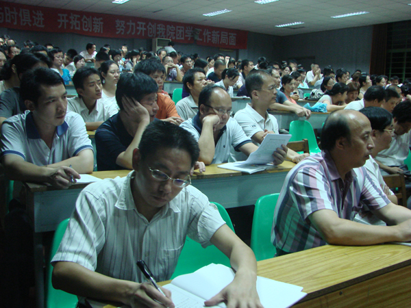 本网讯 9月2日晚,新学期全院教职工大会在天麟校区阶梯教室召开,院长李宝银从九个方面回顾了2010年上半年工作,从八个方面对新学期工作进行了部署。党委书记徐志荣对全院教职工提出了希望和要求。(麒生 摄)