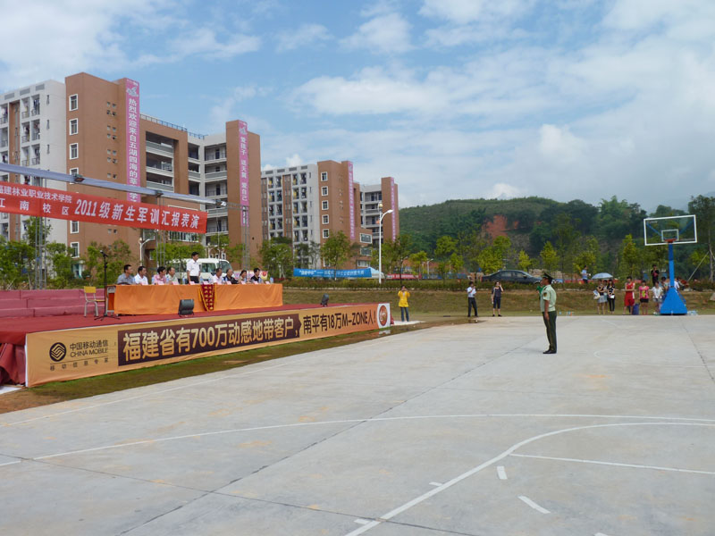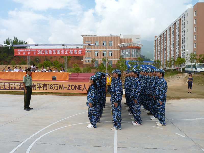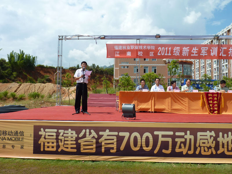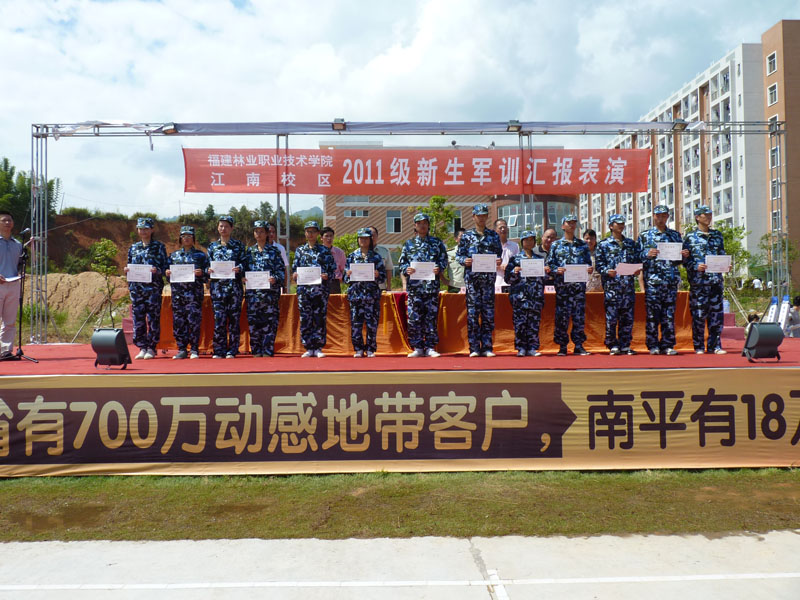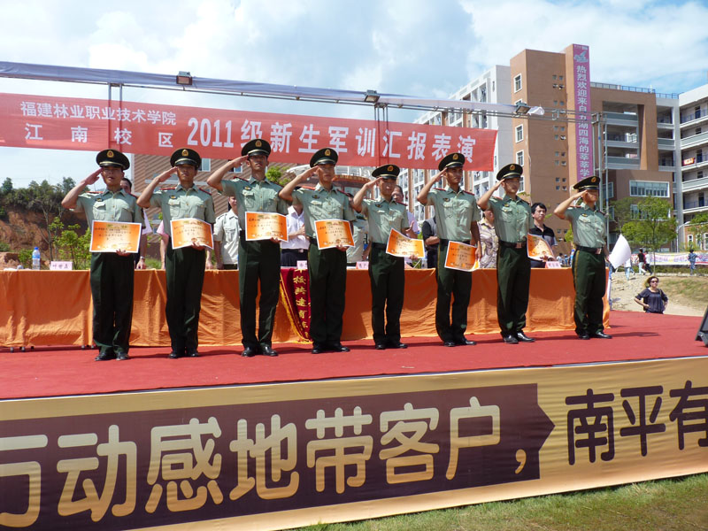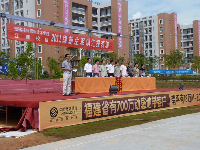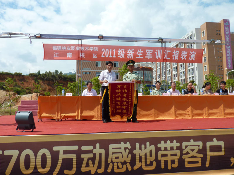 9月30日上午,江南校区举行了2011级新生军训会操表演。学院党委书记徐志荣、中国人民武装警察部队南平市森林支队副大队长孙涛、学院人民武装部部长郭先根及有关部门和系领导出席了此次会操表演。通过此次会操,表彰了军训会操表演的前八名和42名军训优秀学员。会操表演结束后,党委书记徐志荣作了讲话,他首先祝贺全体2011级同学在作风上的进步和素质上的增强,并提出了三点希望:一是希望同学们巩固和提高优良的素质,遵守日常行为规范,严格教室、宿舍内务,加强身体锻炼,提高生活自理能力,早日成为一名合格的大学生;二是希望同学们学习解放军的优良作风,不怕苦,不怕累,守纪律,有自觉,高标准,严要求,不断地去除自己身上的陋习,迅速地成长为一名优秀的大学生;三是希望同学们学习解放军为保卫祖国奉献自己一切的精神,并把它转化为 “为中华崛起而读书”的强大动力,努力学习,刻苦钻研,勤学好问,积极进取,早日成为社会主义祖国的有用之材。同时,为了感谢中国人民武装警察部队南平市森林支队对我院军训的大力支持,教官们对我院新生的艰苦训练,学院党委书记徐志荣向中国人民武装警察部队南平市森林支队赠送锦旗一面。(图文:江南校区综合科 邹小燕、徐可意)