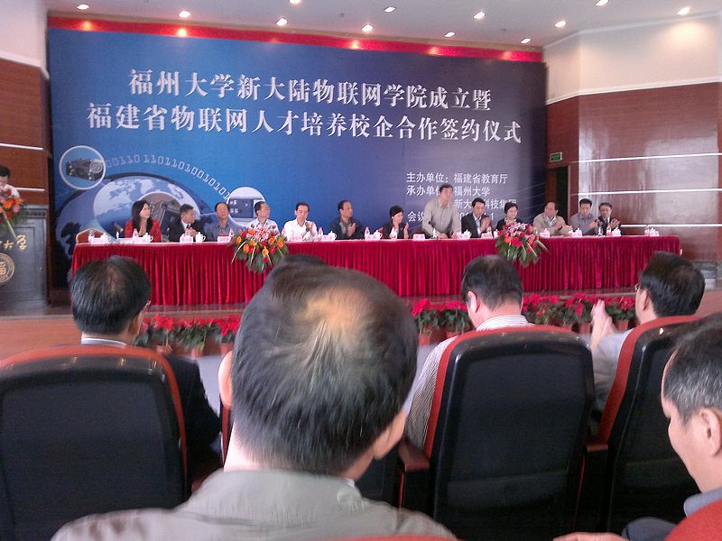 为适应战略性新兴产业发展需求,加快物联网专业急缺人才培养, 我院被教育厅列为福建省16所高职院校开设物联网专业之一。日前,在福州怡山大厦国际厅举行了福建省物联网人才培养校企合作签约仪式,学院党委书记徐志荣、自动化工程系谢金生副教授代表学院出席大会。会上,徐书记代表学院与新大陆集团签署了《福建省物联网人才培养校企合作协议书》。