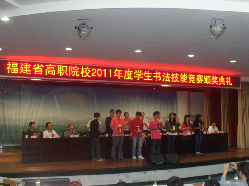 11月18日到19日,福建省高职院校2011年度学生书法技能竞赛在漳州天福茶学院隆重举行。本次竞赛由福建省教育研究会、福建省高职书法教育协作委员会主办,漳州天福茶学院承办。本次比赛共有25所高职院校百余名选手参赛,不仅为选手们提供了展示才能的舞台和切磋借鉴的平台,也为书法爱好的同学搭建起沟通的桥梁。我院派出4名学生参赛。其中,建筑0905班林枫荣获硬笔书法一等奖;会计1138班魏达获硬笔书法二等奖;食品营养与检测1102班张晓强荣、建筑1117班纪杰城均获毛笔书法三等奖。徐洪老师荣获优秀指导老师称号。