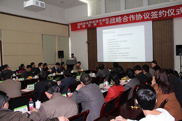兰思仁校长发表了热情洋溢的讲话,他回顾了两校之间悠久的历史渊源,特别是福建林学院在南平办学期间,与福建林业学校密切的交往与合作。他指出,福建农林大学和福建林业职业技术学院各自拥有自身的优势,今后两校在教学、科研、师资培养等方面要充分发挥各自所长,进一步加强交流与合作。今天两校签订的全面战略合作协议将为两校的共同发展拓展一个新的平台。