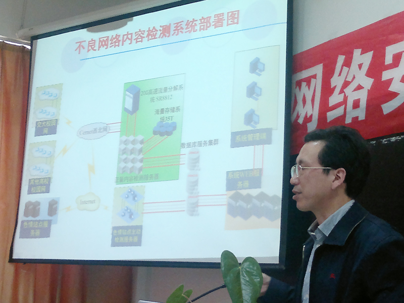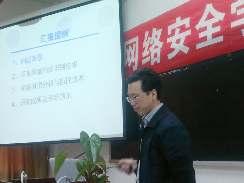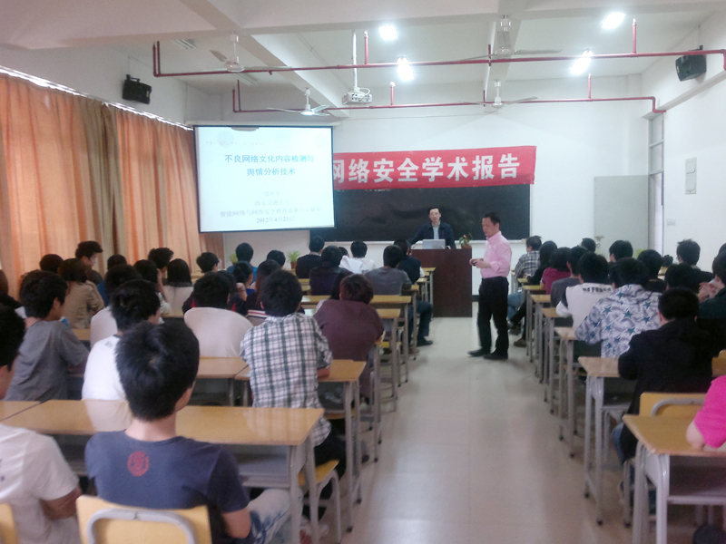 2012年4月21日下午,西安交通大学计算机系主任郑庆华教授到我院作了题为“不良网络文化内容检测与舆情分析技术”的网络信息安全专题学术报告。自动化工程系负责人谢金生副教授主持了报告会,自动化工程系相关专业老师、学生聆听了报告。