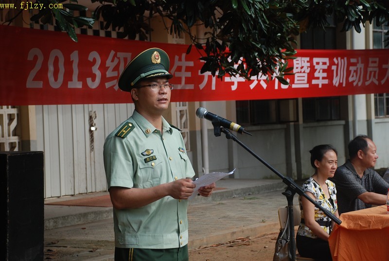 中国人民武装警察部队南平市森林支队南平大队教导员张才宝在讲话中回顾了2008年以来南平市森林支队南平大队与学院的渊源,并希望2013级新生能像往届学生一样重纪律,能吃苦。