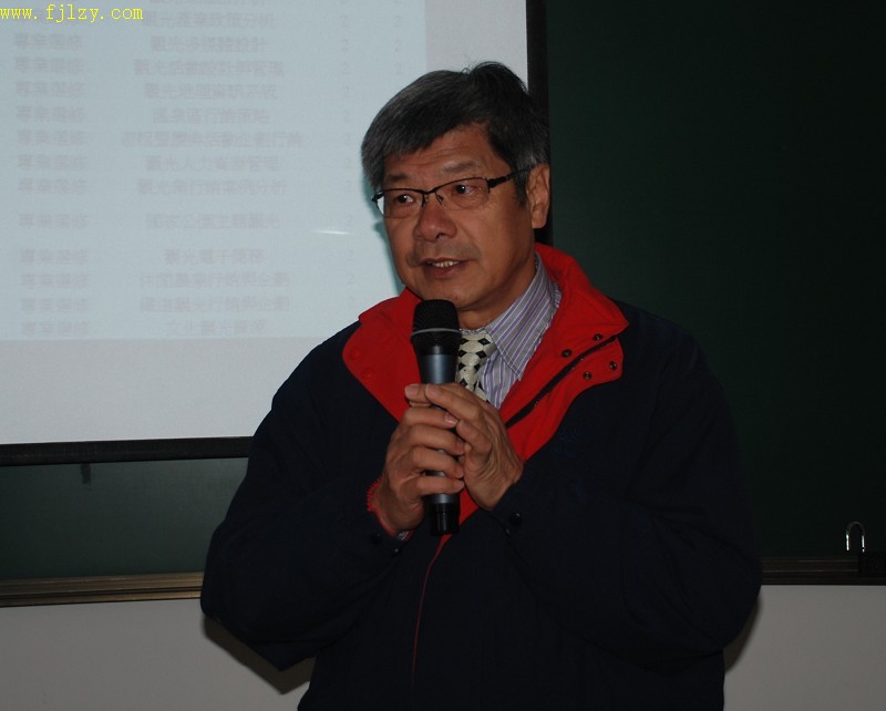 刘教授是嘉南药理科技大学观光专业的教授,他带团目前已经在世界各国都留下了脚印,不仅自己不花钱,还赚钱。他向大家介绍了观光专业的特色,他用一个大陆到台湾学习学生拍摄的小短片,向大家展示嘉南药理科技大学及周边的旅游资源,并欢迎大家到台湾参观、交流学习。