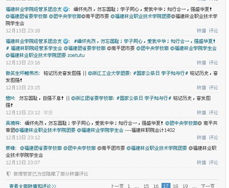 本网讯 为培养爱国主义精神,悼念南京大屠杀遇难者及所有在日本帝国主义侵华战争期间惨遭日本侵略者杀戳的死难中国同胞,揭露日本侵略者的战争罪行,牢记日本侵华战争给中国人民造成的深重灾难。2014年12月13日,院团委开展了“国家公祭日学子知与行”主题纪念活动。按照团中央、福建团省委有关要求,结合学院实际情况,开展了线上、线下纪念活动。院团委积极号召学院广大团员青年们积极参加团中央学校部线上微博评论、话题讨论等互动活动,关注和转发公祭活动微博,学院青年学子纷纷加入到网上“国家公祭日 学子知与行”腾讯和新浪微博互动,参与人数达到4000多人次。同学们发表了“勿忘国耻 奋发图强”、“勿忘国耻 缅怀先烈”等评论,在线缅怀先烈,寄托哀思。