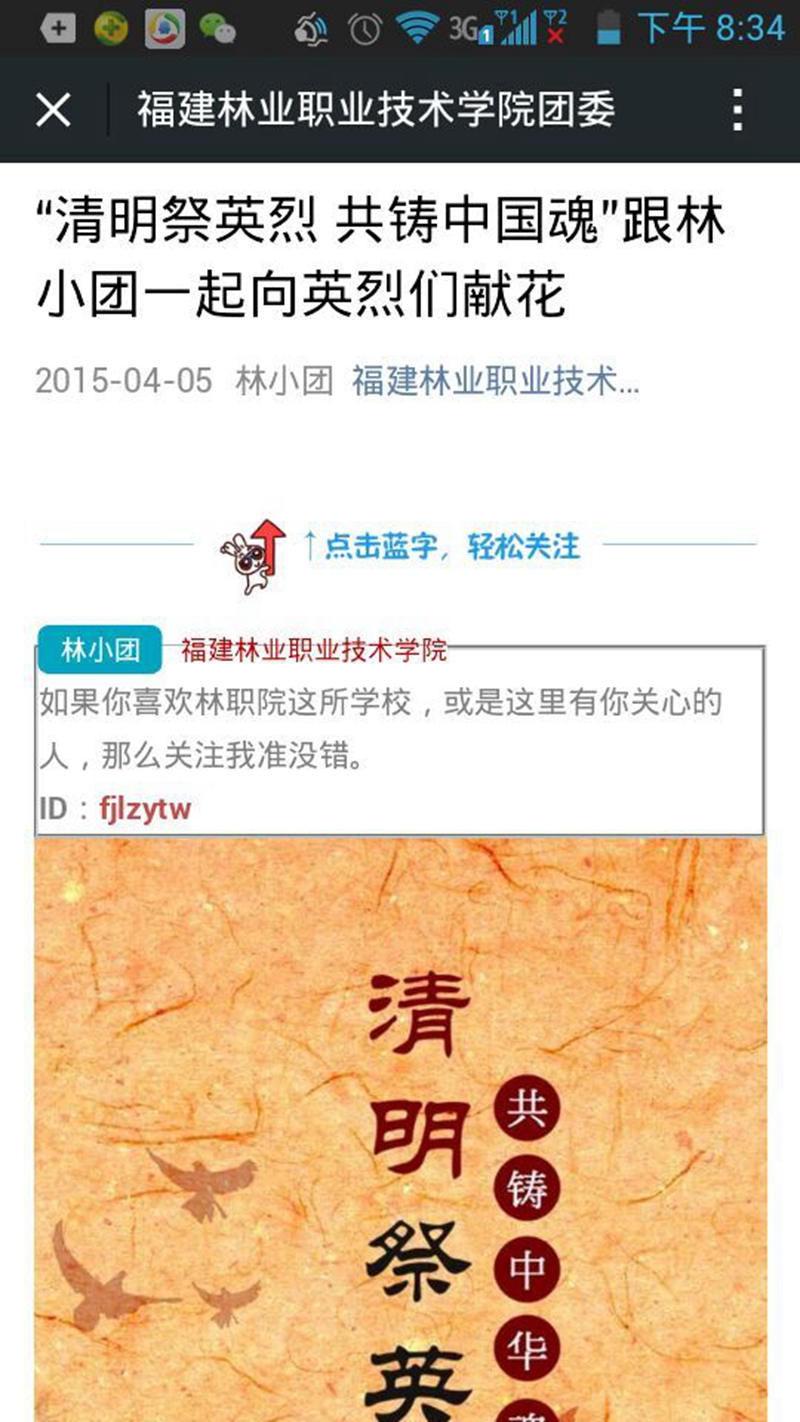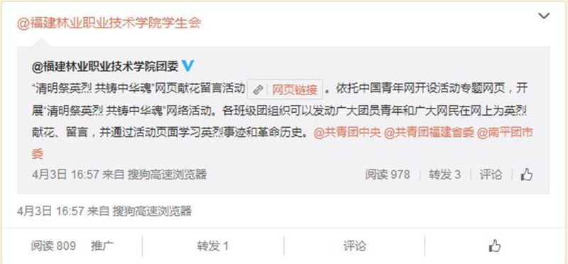 学院团委号召学院广大团员青年们积极参加团中央线上“清明祭英烈·共铸中华魂”网页献花留言活动,为英烈献花、留言,通过活动页面学习英烈事迹和革命历史;在新浪、腾讯微博和微信公众平台发起#清明祭英烈#话题讨论活动,留言写下对英烈的缅怀和敬仰,对话题微博转发、评论、点赞,参与人数达到4000多人次。