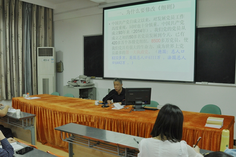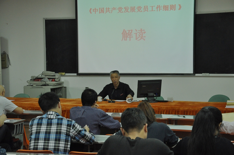本网讯 新版《中国共产党发展党员工作细则》已于2014年6月10日起施行,为了把学习贯彻《细则》不断引向深入,帮助基层党总支进一步准确把握《细则》的基本要求,熟悉掌握《细则》的具体规定,进一步提高学院党员发展工作的科学化和规范化水平,4月29日晚上7:30分,学院党委在天麟校区综合楼6楼会议室举办“学习贯彻《中国共产党发展党员工作细则》培训班”。学院直属党支部书记、各系党总支副书记、各支部组织委员,团委负责人、各系团总支负责人参加了培训。