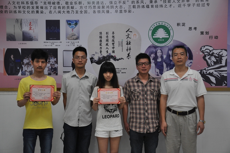 5月13日,由南平发展集团全资子公司福建大武夷电子商务有限公司主办的2015“清新福建·生态南平”“红袍娃”形象设计和旅游商品设计大赛落下帷幕,在来自全国各地的近千幅作品中,广告设计与制作1315班的吴伟坚获得“红袍娃”形象设计大赛三等奖,广告设计与制作1315班曾婷婷、韩杰彬分别获得旅游商品设计大赛二、三等奖。为了尽快将设计作品推广应用,双方签署了知识产权转让协议。为此,吴伟坚、曾婷婷、韩杰彬分别获得了1000元、1000元和500元的转让费。