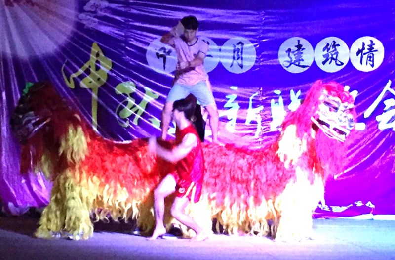 在充满青春活力的街舞队表演后,由建筑工程系建筑1326班吴起明带领的武术队两只雄狮静卧在舞台中央,院长助理郭先根老师带着对15级新生开启崭新大学生活的美好祝愿上台为两只雄狮进行“点睛醒狮”仪式,启动了建筑工程系中秋国庆假期系列活动。接着来自建筑1440班的沈达明等同学用一场名为《成长》的音乐短句,演绎了离家在外求学的孩子与在家守候父母之间浓浓的相思之情,呼唤在外的学子如今便捷的通讯和高铁拉近了家的距离,要常打电话回家、要常回家看看。15级新生陈何静、石林辉等同学也纷纷展示各自特长,用舞蹈、歌曲等表演与同学们共庆中秋。