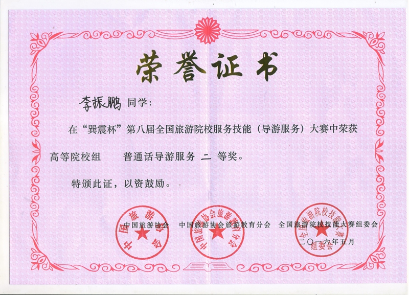 本网讯 5月15日,在刚刚结束的中国旅游协会旅游教育分会和广东省旅游局联合主办的“巽震杯”第八届全国旅游院校服务技能(导游服务)大赛中,由我院林学系李霞老师指导的旅游管理1408班李振鹏同学荣获“高等院校组普通话导游服务”二等奖。