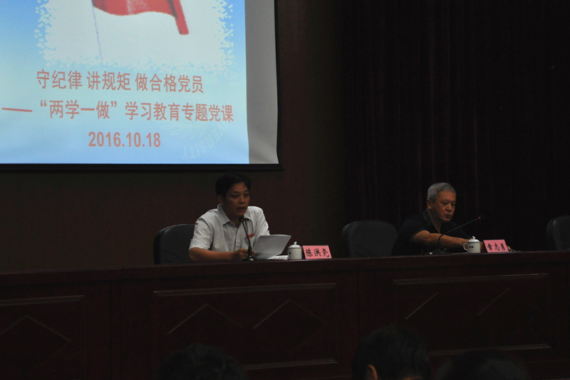 本网讯 为进一步深入开展“两学一做”学习教育, 根据院党委安排,10月18日下午,院纪委书记章志勇在江南校区礼堂上了题为《守纪律 讲规矩做合格党员》的专题党课。党课由党委副书记陈洪尧主持,学院全体师生党员听取了讲座。