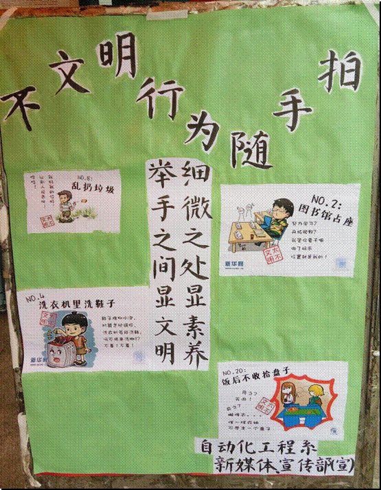 本次“校园文明随手拍”活动号召广大同学从小事做起,从自身做起,从现在做起,共同营造良好的校园学习生活环境,帮助青年学子更好地成人、成长、成才。(自动化工程系 供稿)