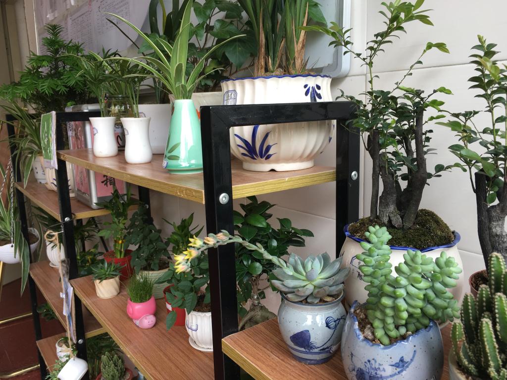 花屋每日都有专人管理花架,观察每盆植物的状态,及时浇水并下架长势不好和有病虫害的植物,定期更新和及时补充花架。花屋植物品种丰富,学生利用专业特长在学院实训基地细心培育,通过采种、剪枝条扦插、分株压条、水培等方法进行扩繁。利用课余时间进行管理,每天观察每个植物的状态,及时浇水并治理长势不好和发虫发病植株,修剪长势过旺的植株,组盆上架更替下架的植物盆位。