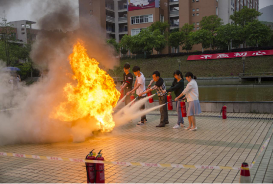 为确保演练活动万无一失,我系提前制定了演练活动方案,内容包括演练安排、演练准备、演练要求、组织机构、演练程序及其他相关要求,并由各位辅导员老师召开动员班会,组织本班学生认真交流学习,做好充分细致的演练培训指导工作。下午,虽然天公不作美,但豆大的雨滴却并未浇熄同学们对本次演练活动的热情。15点50分,全体学生准时到达指定教室集结待命,16点整,随着几声急促的哨响,疏散演练正式开始,教室里的同学冷静快速地从各个教室冲出,来到最近的安全出口,排着队紧张有序地下楼梯,并飞奔向指定区域。在人工湖广场,院保卫科科长胡宗焕老师现场为同学们普及了一些必备的消防安全知识,介绍灭火器的使用方法,并由保卫科老师们为大家演示如何正确使用灭火器。随后,在胡宗焕老师的教授和带领下,辅导员孙钰老师、吴锦鸿老师及在场的学生自愿者亲身体验了一把灭火器的使用及灭火过程,灼烧的火焰、滚滚的浓烟和袭人的热浪深深地震撼了在场的每一位同学。