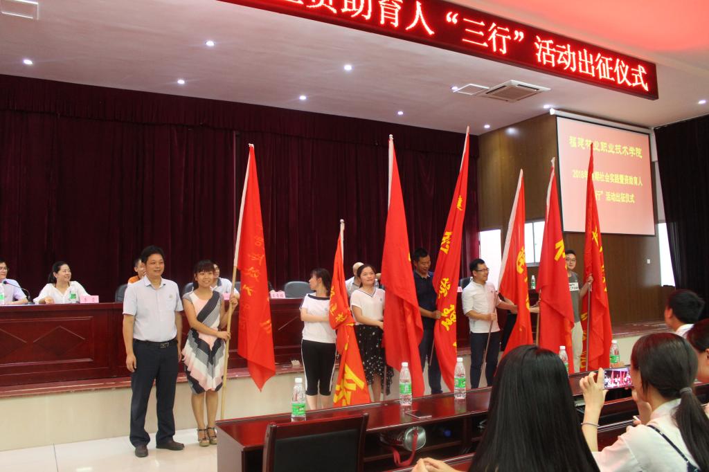 接着,党委副书记陈洪尧为福建林业职业技术学院与宁夏葡萄酒与防沙治沙职业技术学院暑期学习交流团等7支队伍授旗,并代表学院党委预祝活动圆满成功。