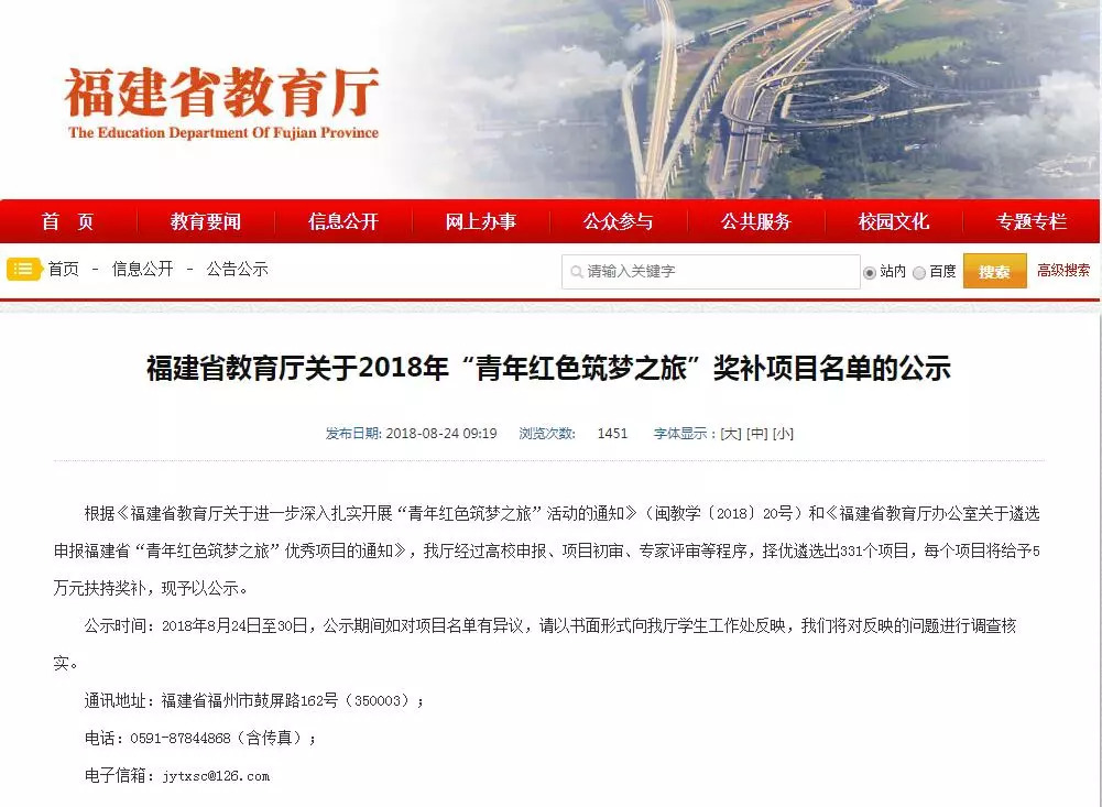 本网讯 日前,省教育厅发布《2018年“青年红色筑梦之旅”奖补项目名单》公示。