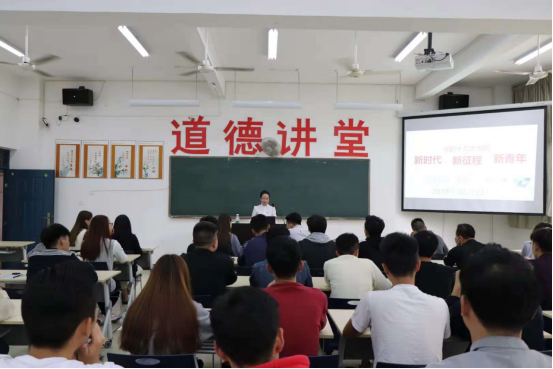本网讯 为了进一步学习贯彻党的十九大精神,2018年10月23日下午,建筑工程系学生党支部在江南校区实训四210教室组织开展了“党的十九大专题——新时代 新征程 新青年”专题讲座。讲座由系党总支书记王云彪老师主持,学院思政部朱丽云老师主讲,建筑工程系近百名学生党员和入党积极分子参加了学习。