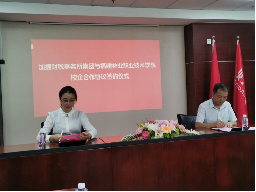 刘院长代表学院同加捷集团常务副总易海林女士签订了校企合作协议,并为加捷集团授予“福建林业职业技术学院校企合作基地”牌匾。刘院长热忱欢迎加捷集团在11月到我院开展专题的宣讲招聘会,希望我院同加捷公司能够以此为良好的开端,逐步深化校企合作,进一步促进提高我院财经专业学生的人才培养质量,也为企业输送高素质的专业人才。
