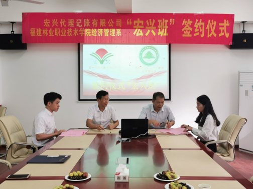 2019年,我院经济管理系与宏兴代理记账公司进一步深化校企合作,经过学生自愿报名、企业面试等程序,选出15名2019级准毕业生组成由宏兴代理记账公司冠名的“宏兴班”,在10月开始到企业当中采取企业现场教学。刘院长代表学院同宏兴会计集团创始人庄惠忠先生、“宏兴班”学生代表共同举行了“宏兴班”签约仪式,签订了学院、企业和实习生三方实习协议书,并授予宏兴集团“福建林业职业技术学院校企合作基地”牌匾。“宏兴班”是学院的一次教育改革尝试,以期能够更好地对接社会人才需求,提高人才培养质量,同时,我院经济管理系也将以此次订单式培养为契机,认真总结经验,适时调整,探索出一种学生、学校和企业多方受益的人才培养模式,更好的为教育教学服务。