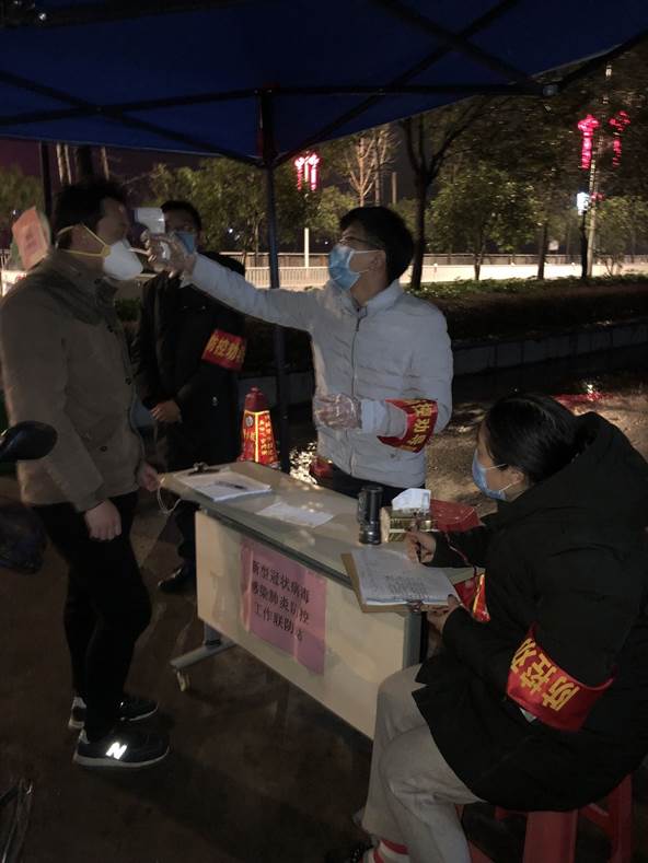 二、书记带头,党员冲锋 一名党员,就是一面旗帜。在防控疫情这一特殊战场上,直属第二党支部的党员没有畏惧,没有退缩,支部书记陈政,教师党员黄丽霞、张毅、薛莉、王梦妮、官冬玲、彭韬、陈红英等人积极响应学院党委号召,将疫情防控作为践行初心使命的“主战场”,服从安排,冲在一线,切实做到守土有责、守土担责、守土尽责,积极参加所在社区和乡村的疫情防控工作。 支部书记陈政同志,是2019年4月经过支部换届选举出来的,首次担任支部书记的时间还不足一年,虽然从未经历过“疫”情这样的“大考”,但是,面对祖国的召唤,他认为作为支部书记就应该冲在前、做在前,当先锋、做表率。2月2日,他第一时间主动到水南街道江南社区报到,参与社区防控劝导志愿服务工作。他执勤时间都是晚班,一般从下午16:40值班到晚上21:00,在元宵节那天更是值班到晚上22:30,用自己的实际行动为全体党员树立了榜样。“我是支部书记,也是一名老党员,在面对疫情防控的关键时刻,积极带领党员投入到疫情防控一线,全力打赢防控疫情攻坚战,我责无旁贷。”陈政说。