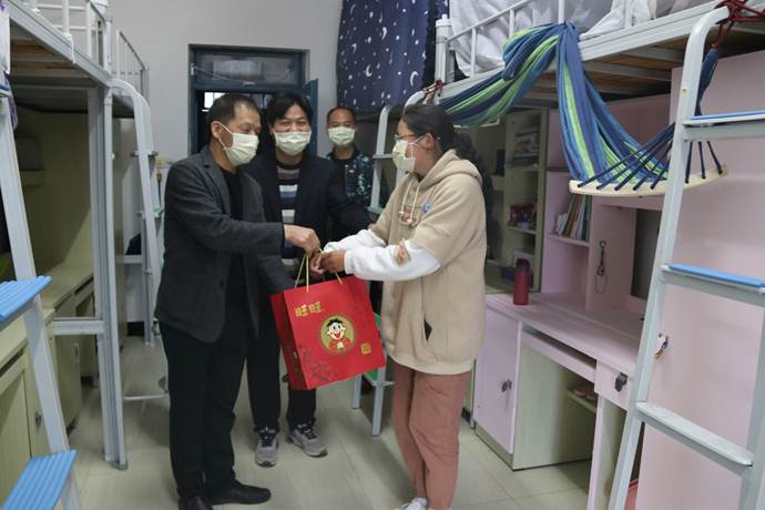 刘院长逐个宿舍走访慰问假期留校学生并送上慰问品,详细询问同学们的生活与饮食情况,并叮嘱他们在疫情防控期间,注意开窗通风,保持身体健康,提高防范意识,做好科学防护。他还向同学们介绍了目前疫情防控的基本情况,希望大家增强信心,做好自我防护并积极配合,有困难随时与辅导员、留校值班老师联系。同时对同学们提出三点希望:一是希望同学们要充分信任理解并配合学校及相关部门疫情排查及统计工作,及时关注并如实汇报自身状况,同时多向家人报平安;二是希望同学们利用好这个时间,静下心多读书,同时积极锻炼身体,面对疫情保持镇定,不信谣、不传谣、不造谣,共同抗击疫情。三是希望同学们能做好疫情预防,尽量减少出行,避免在人员密集区或封闭、空气不流通的公众场所活动,自觉佩戴口罩,勤洗手,提高疫情预防意识和预防能力。随后刘院长一行还检查指导疫情期间学生宿舍管理工作,要求相关部门做好相应的工作预案,以确保学生宿舍的卫生、安全。