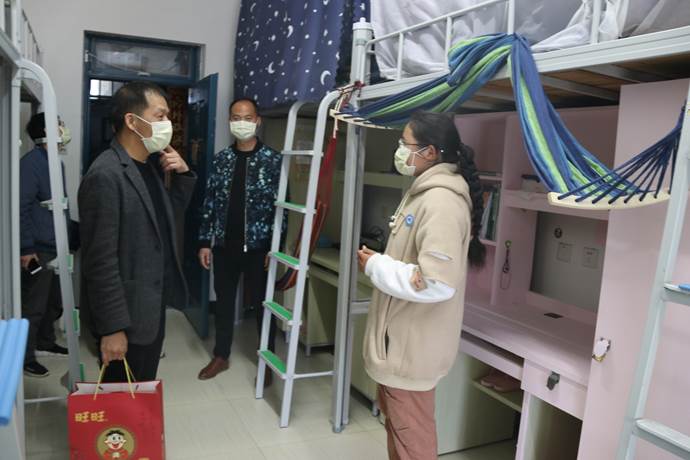 本网讯 2月27日下午,院长刘文开、院党委副书记严绍裕等一行6人走访我院学生宿舍楼,看望慰问我院寒假期间留校学生。学生处、自动化工程系党总支、园林系党总支等部门负责同志参加慰问。今年寒假期间,我院共有8名学生留校,其中新疆籍学生3人,西藏籍学生5人。