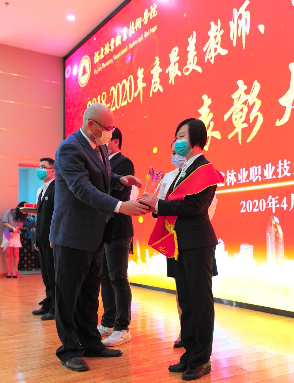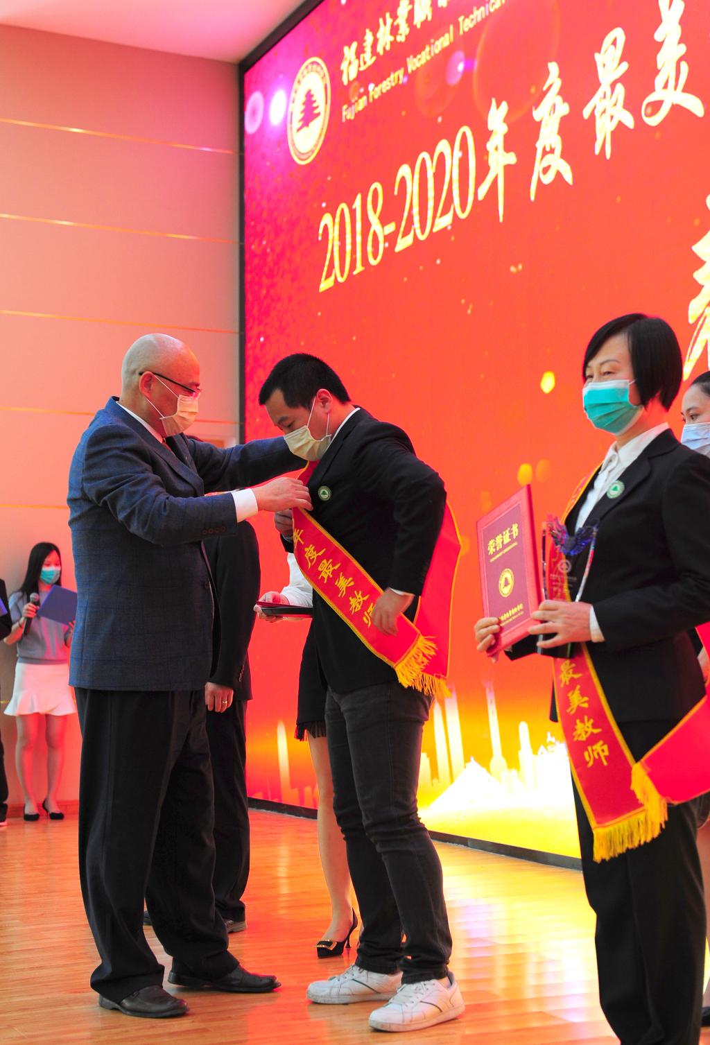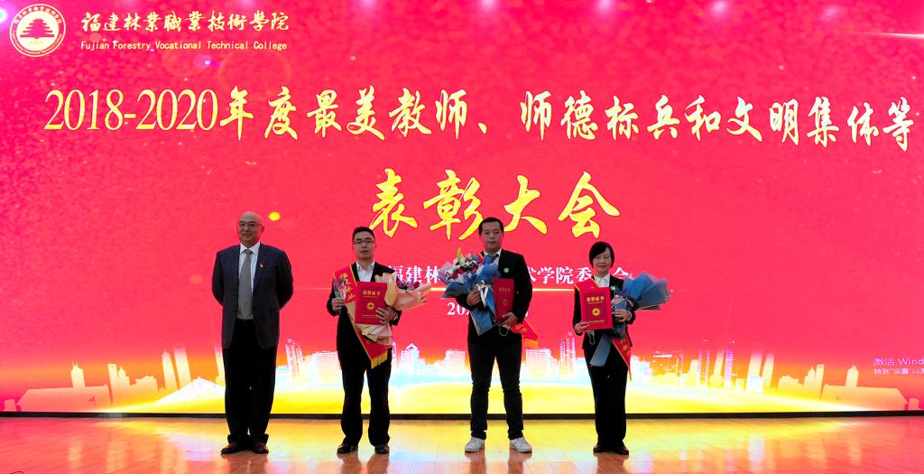 学院2018-2020年度“最美教师”和“师德标兵”表彰是本次表彰大会的重头戏。陈亮、华建祥、黄云玲(排名不分先后)等3位福建林业职业技术学院2018-2020年度“最美教师”及高蓉、黄华明、陈友益、洪福兴、连颖(排名不分先后)等5位福建林业职业技术学院2018-2020年度“师德标兵”受到隆重表彰。“他,虽然不是正式的在编教师,却充满爱心和恒心。”自2004年起,陈亮老师坚持献血16年,共献血47次,合计18220毫升,其中全血2800毫升,血小板75.1个治疗量;华建祥老师用最专业的代码语言为学生解疑答惑,以平台服务师生,用知识浇灌课堂,以技能成就学生;黄云玲老师30多年甘守三尺讲台,课堂教学扎实,热爱关心学生,勤勤恳恳、踏踏实实,她用这种平凡赢得了学生的尊重……一段段VCR,一个个模范人物的感人事迹,主持人一句句饱含深情的颁奖词让现场每一位师生深受感动。