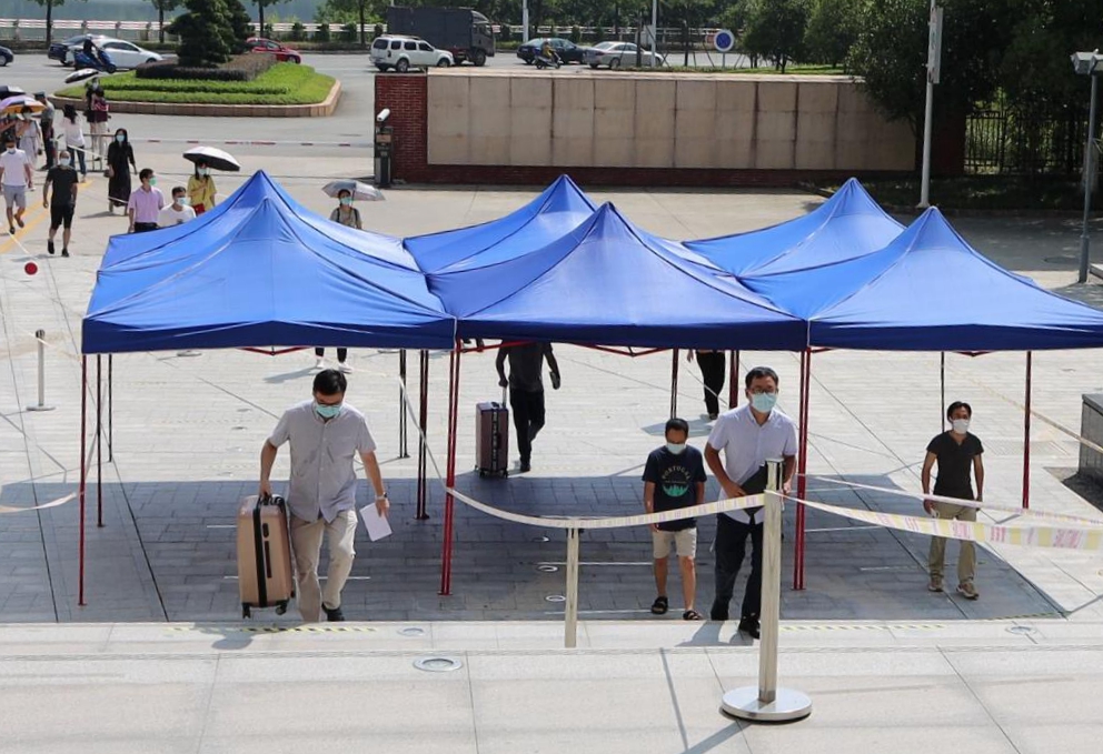▲学生有序排队,测温进入宿舍