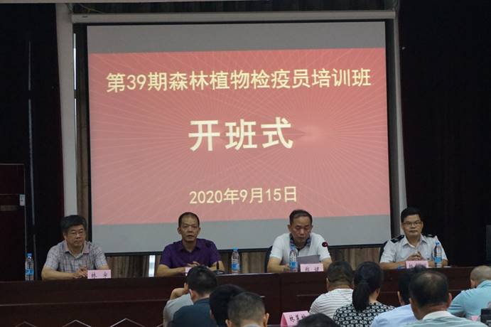 本网讯 9月15日上午,福建省林业局第39期森林植物检疫员培训班在我院天麟校区开班。我院院长刘文开、省林业局副局长郑健、省林业有害生物防治检疫局局长杨细明、省林业有害生物防治检疫局二级调研员林宇等出席开班式。刘文开院长对培训班顺利开班表示祝贺,强调了培训期间疫情防控工作,并详细介绍了学院基本情况和近年来取得的成果。郑健局长要求参训学员要充分认识森林植物检疫的重要性,准确把握当前检疫工作的新形势,努力提升履职尽责能力。