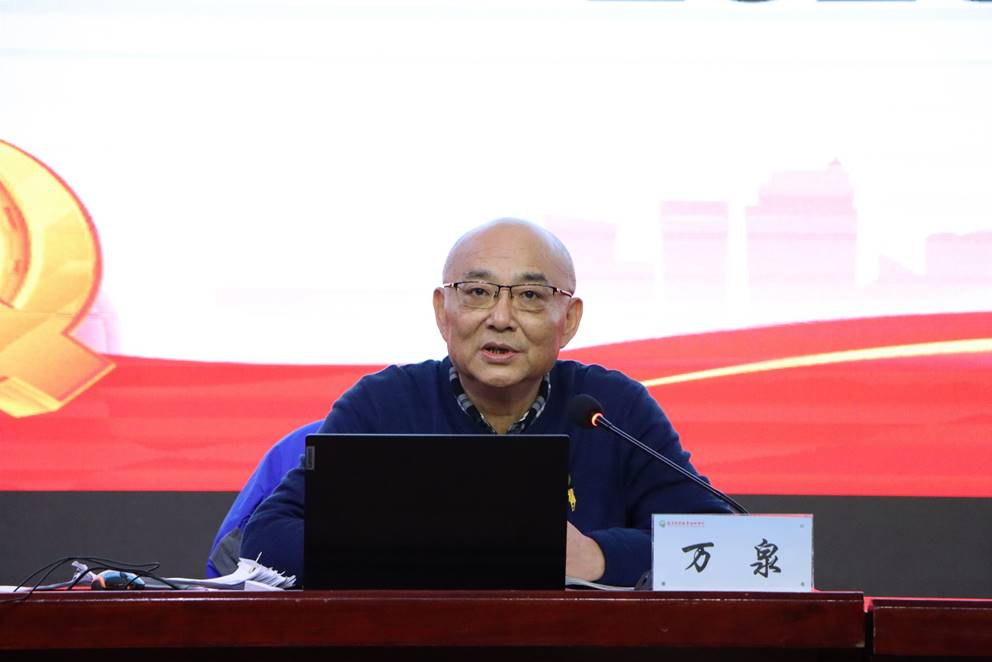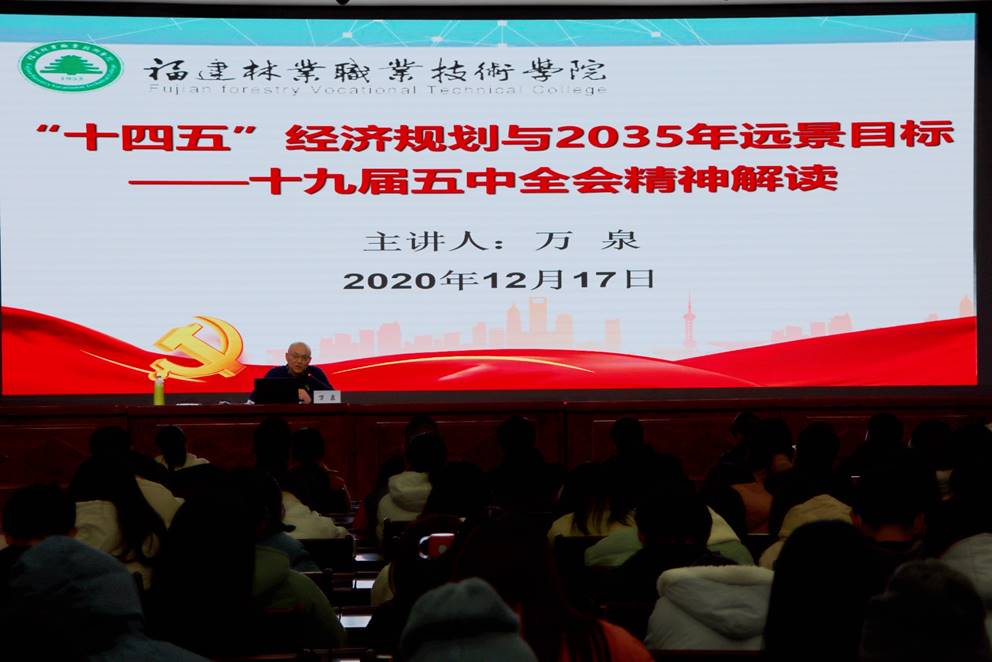 2020年12月17日下午,院党委书记万泉在江南校区礼堂,以“‘十四五’经济规划与2035年远景目标——十九届五中全会精神解读”为主题,为马克思主义学院专兼职教师、林学系学生代表、工程造价1902班学生共计250余人上了一堂生动的形势与政策课。
