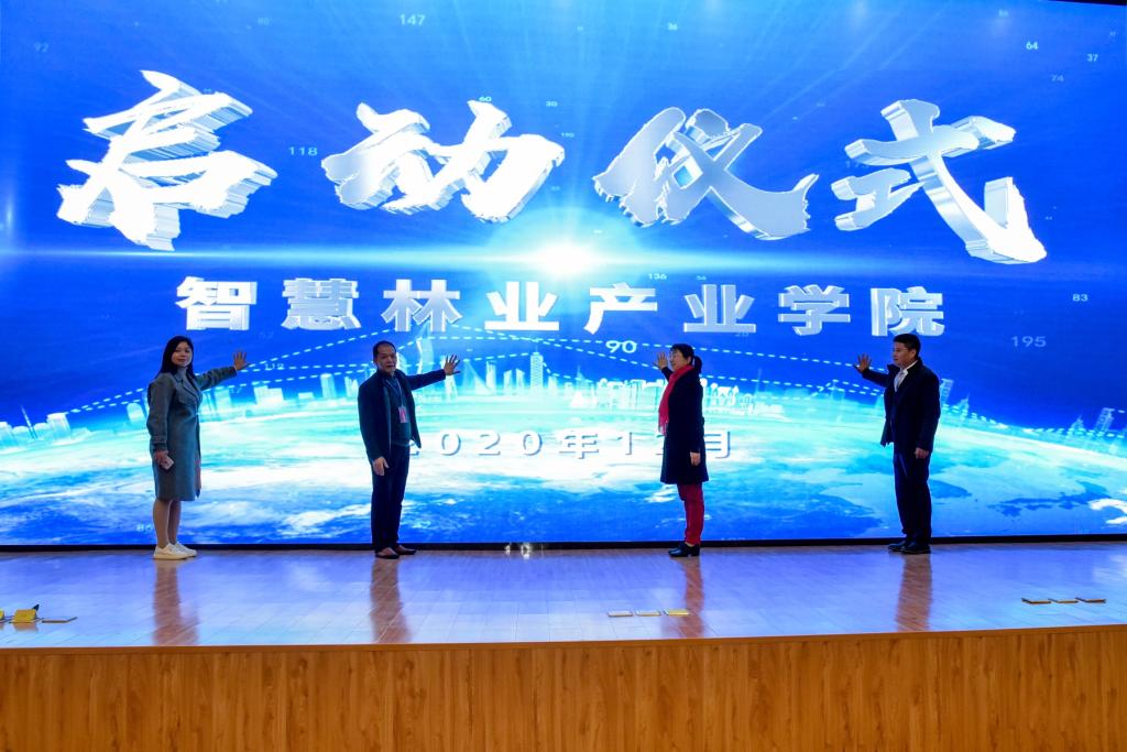 会上还举行了省级智慧林业产业学院启动仪式。建设产业学院是深化产教融合、校企合作的重要模式,也是推动高职院校主动对接行业产业需求,培养产业适用人才的重要载体。由福建林业职业技术学院和福建中量智汇科技有限公司、福建兴宇信息科技有限公司共建的智慧林业产业学院于2020年11月获福建省高职院校产业学院试点项目立项,项目建设期为3年,建设经费预计投入1000万。学院首个省级产业学院的成立,标志着学院在产教融合、校企合作的办学上进入一个新的里程碑。福建省林业局人教处石慧英调研员、福建林业职业技术学院刘文开院长、福建中量智汇科技有限公司孙彤总监、福建兴宇信息科技有限公司陈伟总经理共同启动省级智慧林业产业学院建设,见证了这令人振奋的时刻。