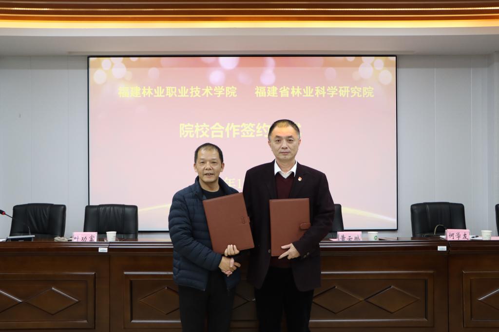 本网讯 为构建“政校行企”多元育人平台 ,创新人才培养模式,促进院校双方各展所长、协同创新,全面提升科技创新和服务经济社会发展的能力,促进林业科技合作与交流,12月29日下午,福建林业职业技术学院与福建省林业科学研究院合作协议签约与授牌仪式在我院江南校区举行。我院党委副书记、院长刘文开教授,福建省林业科学研究院院长黄云鹏教授级高工出席仪式并分别代表双方签署协议。