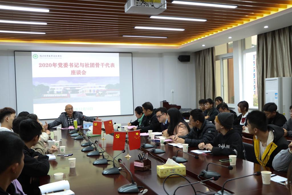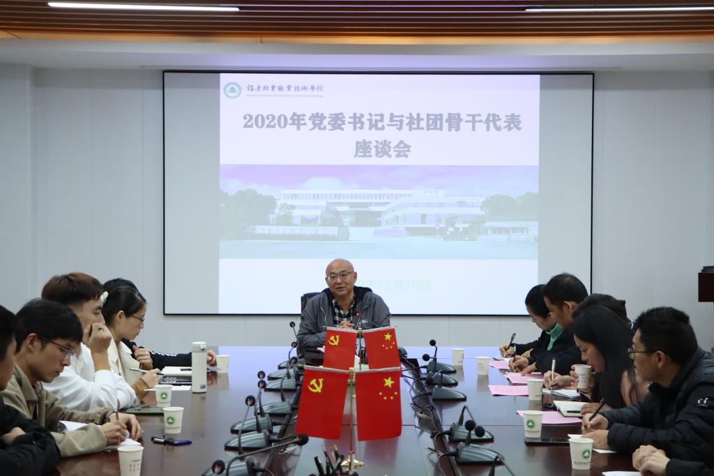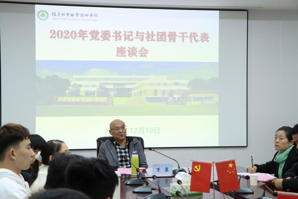 12月10日,万泉书记会见了我院社团骨干师生代表,就学院社团工作开展情况及如何规范社团管理,促进社团健康发展,提升校园治理能力等问题进行了座谈。会上,23位学生社团负责人代表逐一围绕学生社团活动经费、活动场地、指导教师、跨校区社团运行等方面提出了意见建议;社团指导教师代表对持续激发社团活力,助力校园文化建设提出自己的看法。“大学时期,我是田径社的会长,曾代表学院参加全国大学生运动会比赛,弹吉他、吹萨克斯、拉二胡……都是我大学时期的兴趣……”座谈会上,万泉书记和与会同学畅聊了自己大学时期参加社团活动的趣事,并在认真听取同学们的发言后一一发表了自己的看法。比如万泉书记对文学社想通过举办知识竞赛等方式提升社团影响力表示认可,他指出天麟文学社在学院历史悠久,希望文学社能在手机快餐文化泛滥的今天继续做大做强。当得知武术协会计划与闽北职业技术学院共同举办真人实战演练等活动时,万泉书记非常高兴,他指出社团要与其他院校的协会定期进行成果交流,在提升本校协会的知名度的同时也增强了两校的联系、对会员本身也有督促和互相促进的益处。