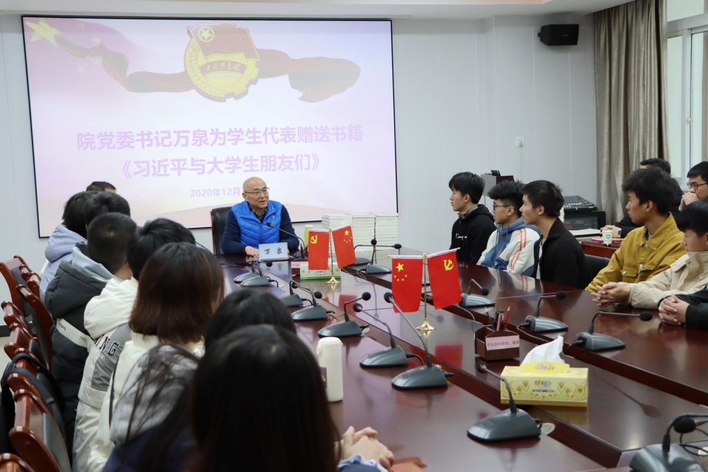 会后,万泉书记向学生代表及各系学生科长赠送书籍《习近平与大学生朋友们》。《习近平与大学生朋友们》出版后,院党委深刻认识到该书是深入学习习近平总书记关于青年工作的重要思想的鲜活读本,对做好新时代青年工作、助力当代青年健康成长具有重要示范意义,引导同学们从不同年代青年与时代共奋进的真实经历中收获感悟、汲取力量,在思想成长、专业学习与社会实践方面融合发展。
