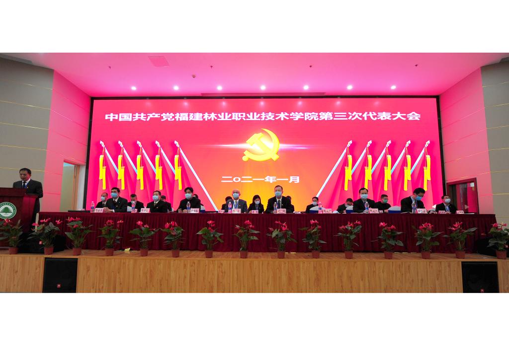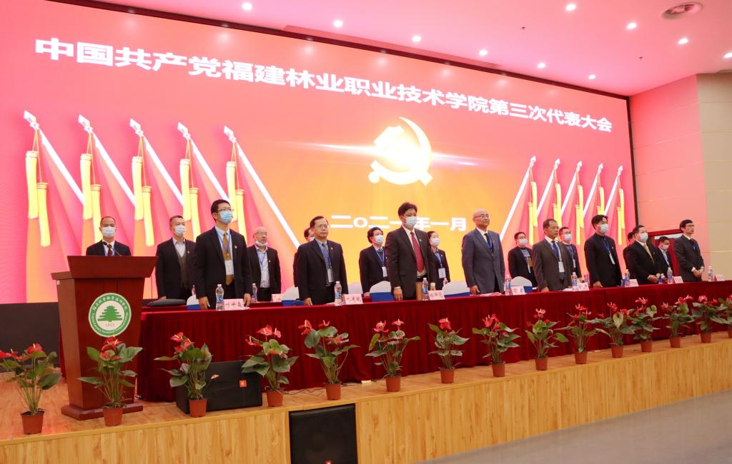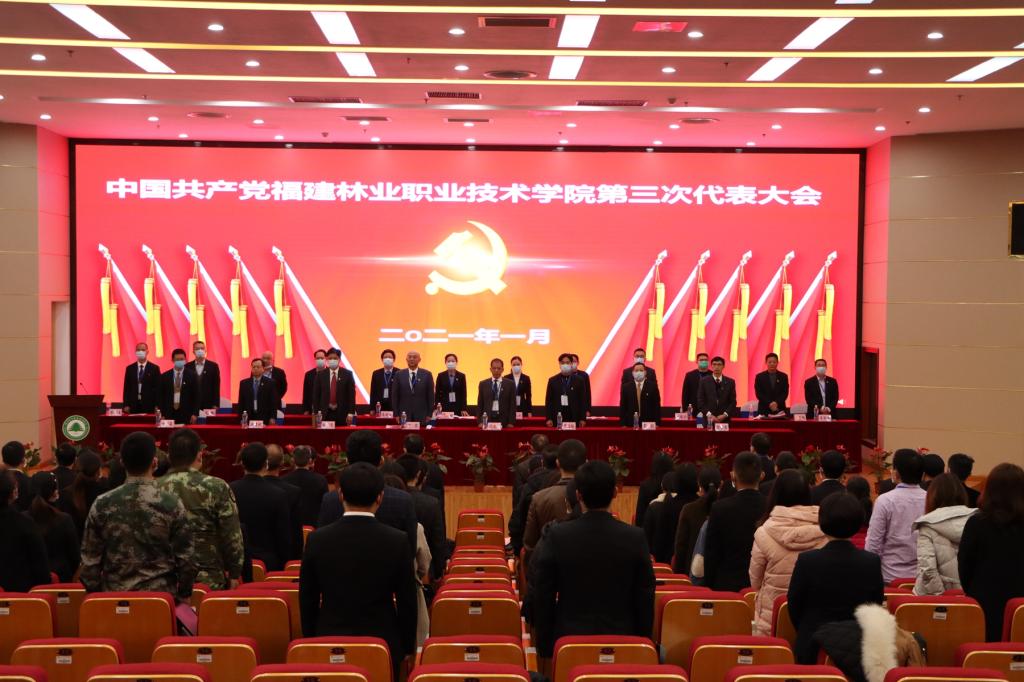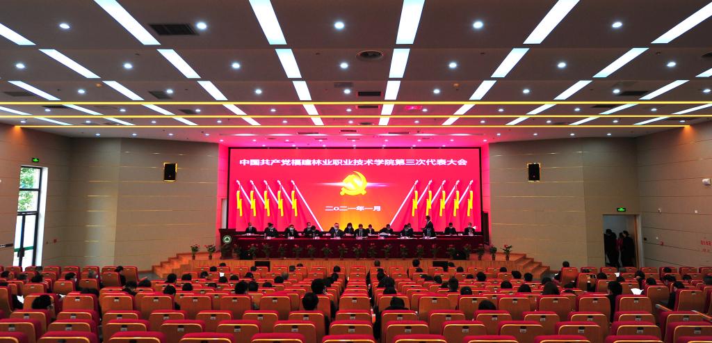 本网讯 面向新时代,奋力新征程。2021年1月22日,福建林业职业技术学院江南校区图书馆报告厅气氛庄重热烈,中国共产党福建林业职业技术学院第三次代表大会在此隆重召开。主席台上方电子屏“中国共产党福建林业职业技术学院第三次代表大会”的会标,10面鲜艳的红旗分列两侧,簇拥着镰刀和锤头组成的党徽分外夺目。会场后方,“攻坚克难 砥砺前行 为加快建设高水平福建林业职业技术学院而努力奋斗”的奋斗目标鼓舞人心。