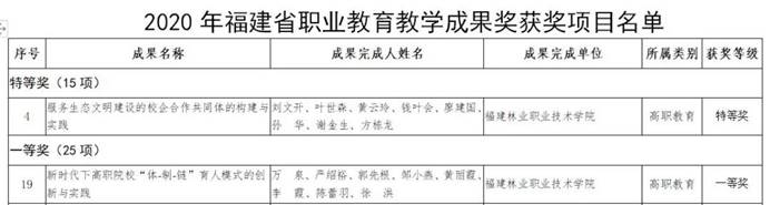 我院申报的教学成果《服务生态文明建设的校企合作共同体的构建与实践》荣获2020年福建省职业教育教学成果奖特等奖, 教学成果《新时代下高职院校“体-制-链”育人模式的创新与实践》荣获2020年福建省职业教育教学成果奖一等奖。