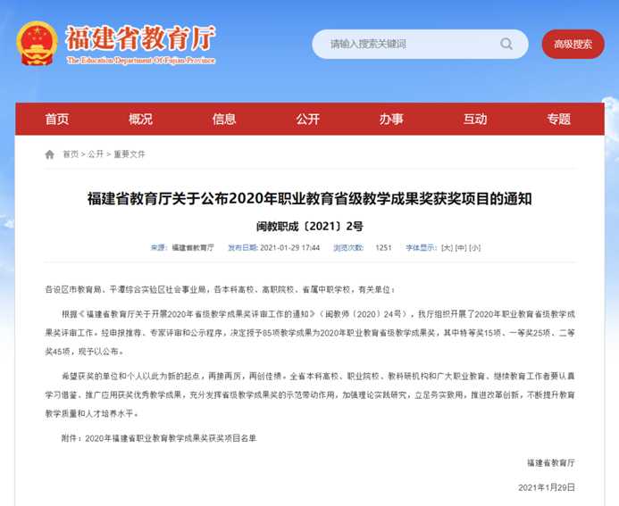 据悉,福建省职业教育教学成果奖是我省职业教育领域政府类的最高级别奖项,代表了当前我省职业教育教学工作的最高水平,是学校人才培养工作水平和教育教学改革成果的核心指标,是对省内职业教育人才培养、教学建设和教学改革成果的检阅和展示。