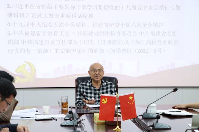 会议学习了中共福建省委教育工委 中共福建省纪律检查委员会 中共福建省委组织部 中共福建省委宣传部关于印发《贯彻落实(关于加强高校党的政治建设的若干措施)的实施方案》的通知(闽委教组〔2021〕6号)文件精神,院党委副书记严绍裕以“强化责任,切实加强学院党的政治建设”为题,从“加强高校党的政治建设”相关文件出台的历史背景和发展脉络、深刻理解加强新时代高校党的政治建设的重大意义、准确把握“关于加强高校党的政治建设的若干措施实施方案”主要内涵、学习贯彻落实建议等四个方面作了解读。