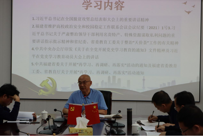 与会同志集体学习了习近平总书记在全国脱贫攻坚总结表彰大会上的重要讲话精神,福建省维护高校政治安全和校园稳定工作联系会议(会议纪要〔2021〕1号),习近平总书记关于严肃整治领导干部利用名贵特产特殊资源谋取私利问题重要讲话精神,中共中央办公厅印发《关于在全党开展党史学习教育的通知》文件精神及习近平在党史学习教育动员大会上的讲话,《中共福建省委关于开展“再学习、再调研、再落实”活动的通知及福建省委教育工委、省教育厅关于开展“再学习、再调研、再落实”活动通知》文件精神。